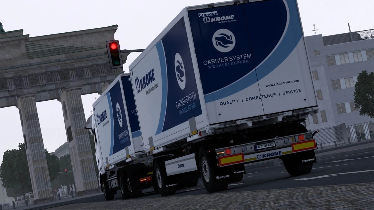 Diese Modifikation beinhaltet einen neuen Drehkranzanhänger (Krone Profi Box Carrier AZW18 eLB9) sowie einen Zentralachsanhänger (Krone Profi Box Carrier ZZW18 eLB10).