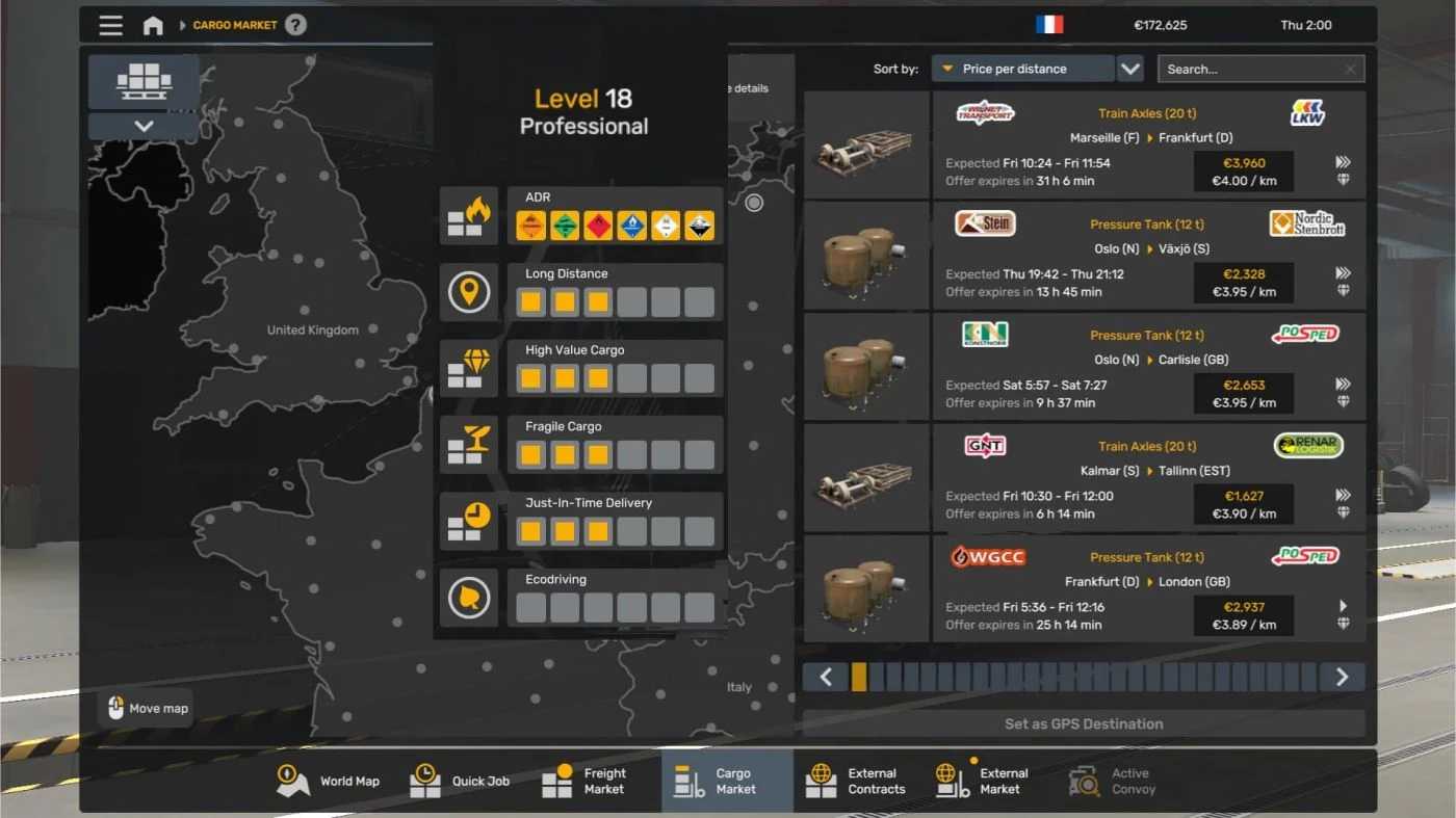 Frachtraten: Neu berechnet und angepasst, um realistischere Marktbedingungen widerzuspiegeln. Die Preise wurden für alle Auftragsarten, einschließlich externer Verträge (World of Trucks), angepasst.