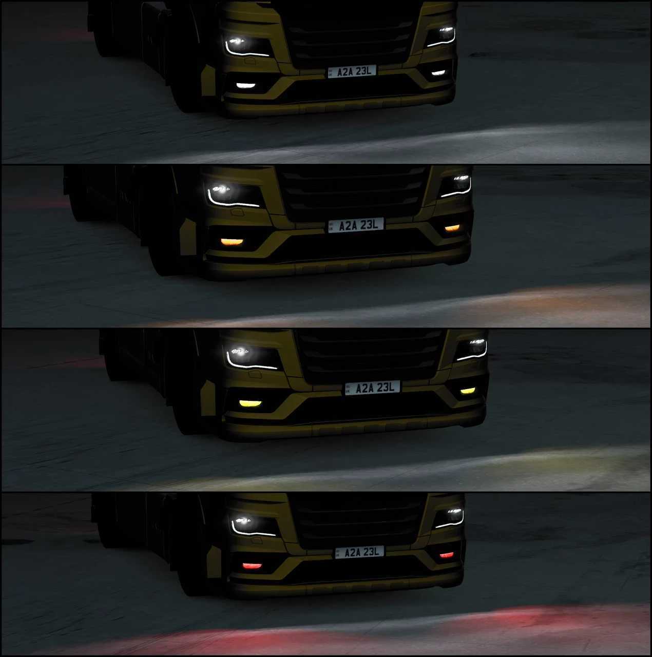 Diese Modifikation fügt dem serienmäßigen MAN TGX 2020 neue „LED“-Scheinwerfer mit funktionierenden weißen, gelben, gelben und roten Nebelscheinwerfern hinzu.
